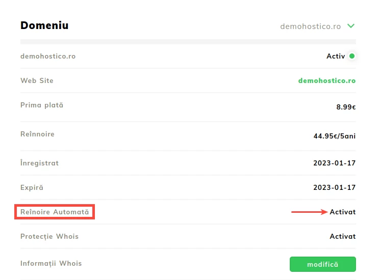 - Attention - with this option enabled from Hostico, no notifications regarding domain expiration will be received. It should be activated only for domains that will no longer be used/whose renewal is no longer desired.